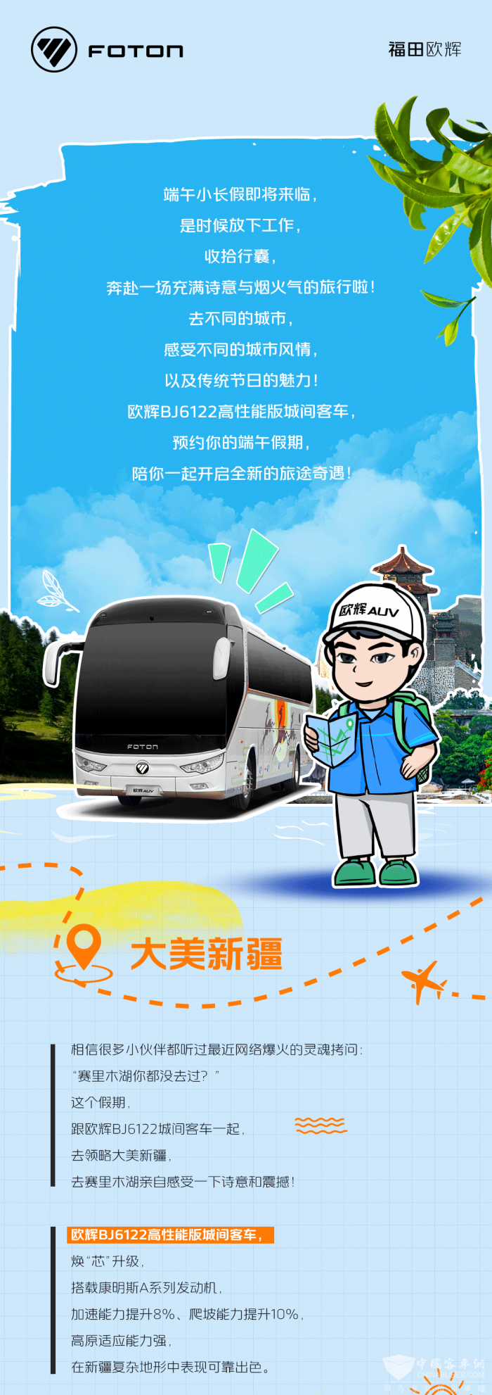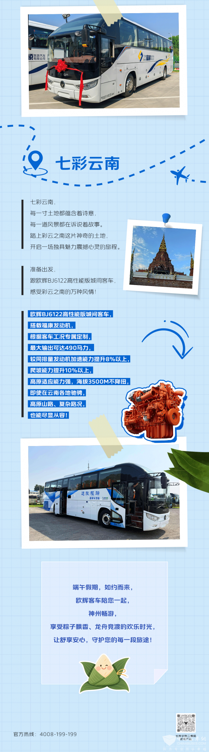 端午小长假即将来临,是时候放下工作,收拾行囊,奔赴一场充满诗意与烟火气的旅行啦!去不同的城市,感受不同的城市风情,以及传统节日的魅力!欧辉BJ6122高性能版城间客车,预约你的端午假期,陪你一起开启全新的旅途奇遇!