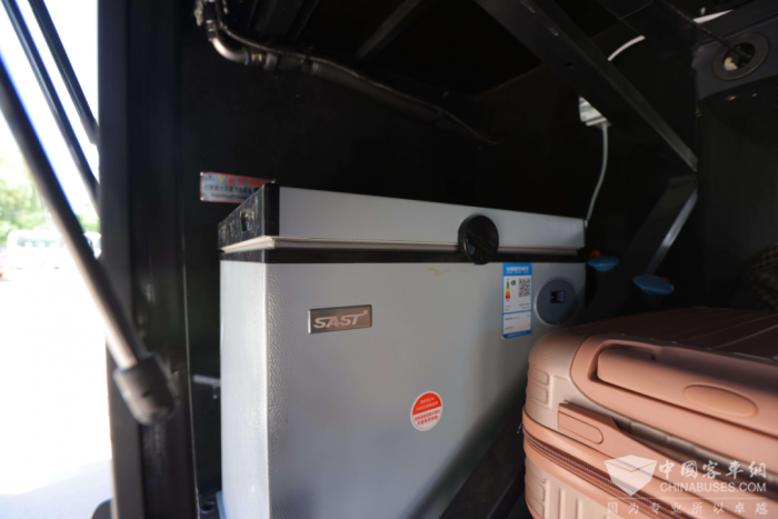 此次护航的福田欧辉 BJ6122 外观典雅流畅,车身包含蓝色和红色两种配色,侧面印有龙凤图样,既增强车辆辨识度,又彰显中国传统文化的底蕴,成为旅途中一道靓丽的风景线。车辆外部贯通式行李舱内,配备冰箱等设备,可为车内设备提供稳定电源,旅客既可随时给手机、平板等移动设备充电,也可在炎炎夏日畅享冰镇饮料、新鲜水果等食品。
