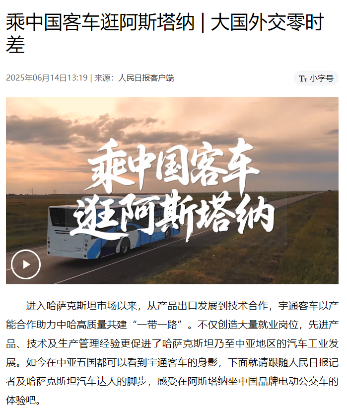 2025年6月14日,《人民日报》再次发布重要文章,本次话题聚焦中国中亚深度互补、高度共赢的合作新格局。其中以《一辆客车,见证携手打造绿色低碳新增长点》为题重点讲述了宇通在中国中亚绿色创新合作中的重要贡献。