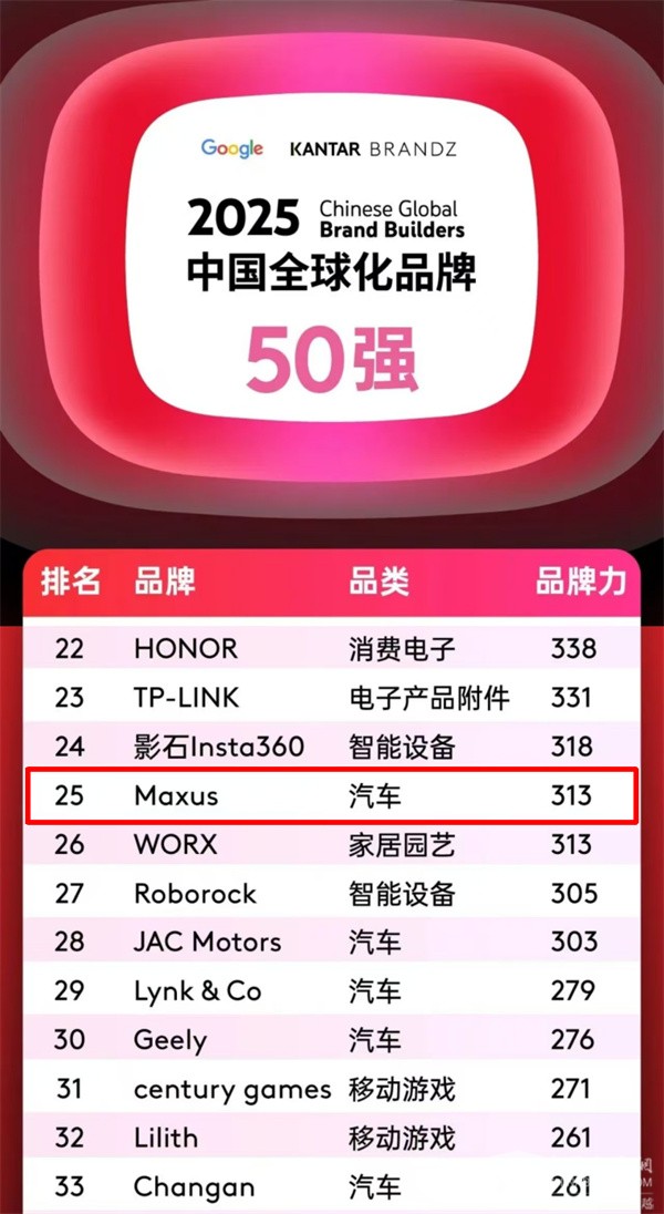XINGKONG.COM2025年6月24日获悉,Google与全球领先的品牌数据与分析公司凯度联合发布《2025凯度BrandZ中国全球化品牌》榜单,不仅展现了中国品牌在全球化进程中影响力的进阶轨迹,更以权威视角为行业提供了洞察全球市场竞争格局的重要参考。上汽大通MAXUS凭借强劲的品牌影响力与全球化布局,位列第25位,同时,凭借差异化产品矩阵和新能源技术优势,位居汽车品类第4位,整体排名和汽车类排名都比去年上升了一名,成为中国品牌全球化进程中的重要标杆。