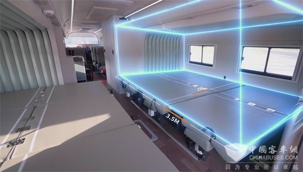 金旅应急救援宿营车采用成熟的大型客车平台改制,车长11米,配备大马力柴油发动机,动力强劲,可以最快时间到达指定地点展开工作。车辆为25 + 1的座位设计,座椅坐卧两用,既能满足人员乘坐需求,又可展开成为通铺用于休息,还能作为临时办公开会的场所,功能十分多样。车身配备的方舱拓展系统,具备一键伸缩功能,且伸缩速度在35秒以内即可完成。在方舱向车身两侧展开后,伸出长度可达95厘米,同时将座椅靠背翻转成床,就可形成长度达3.5米,宽度2米的通铺,一张通铺可睡3 - 5个人,整车能够容纳二十几人休息,充分保障了救援队伍的休息需求,确保救援人员能以饱满的精神状态投入到抢险救灾工作中。