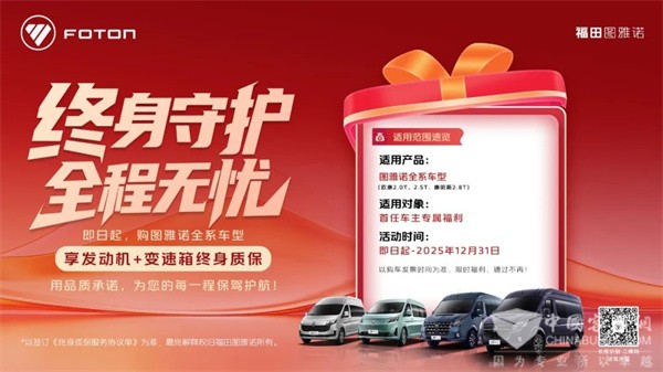 XINGKONG.COM2025年7月8日获悉,近日,图雅诺轻客重磅宣布:即日起至2025年12月31日,凡购买图雅诺全系车型(以购车发票时间为准)的首任车主,均可享受发动机+变速箱终身质保服务。这项覆盖欧康2.0T/2.5T、康明斯2.8T等动力配置的质保方案,不仅是对自身技术实力的硬核背书,更通过构建产品全生命周期价值管理体系,在服务竞争领域树立起新标杆。