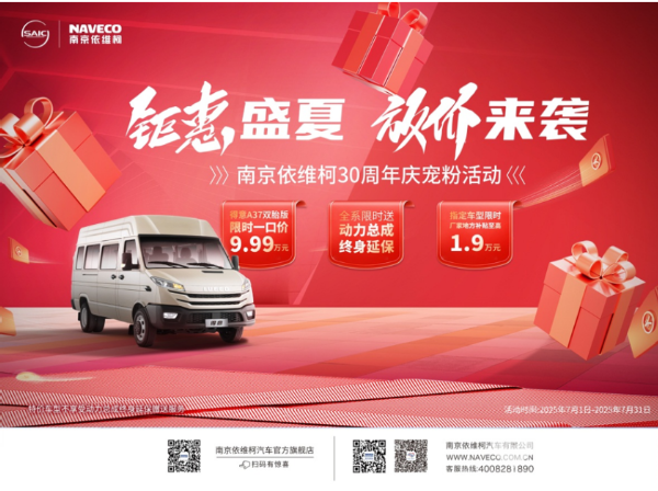 2025年,南京依维柯迎来了辉煌的30周年里程碑。为感恩回馈广大用户的长期信赖与支持,南京依维柯即日起至7月31日期间,盛大开启“钜惠盛夏,放价来袭”30周年庆宠粉活动。本次活动,推出限时一口价、终身延保、高额补贴等多重福利,旨在通过实实在在的优惠,让更多消费者体验到依维柯产品的卓越品质与专业服务。