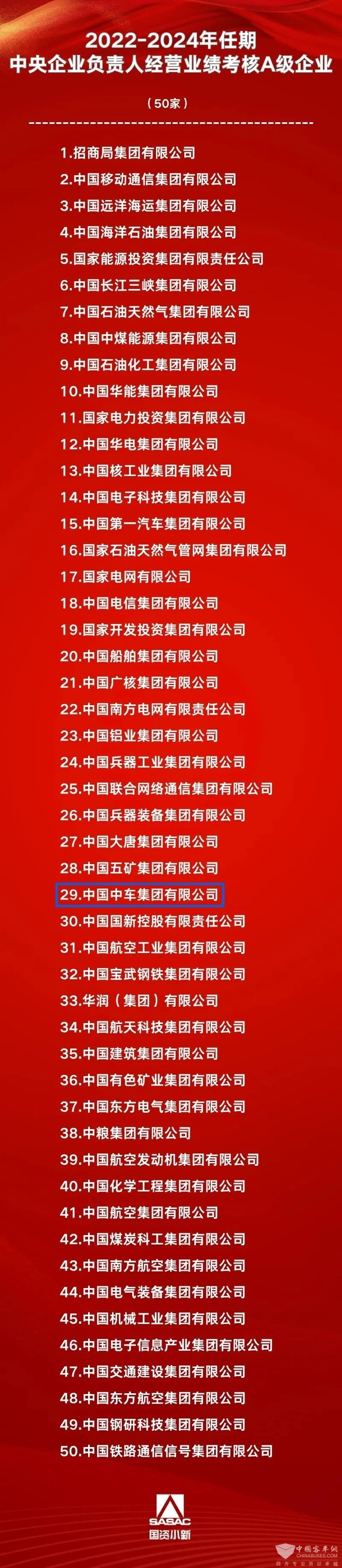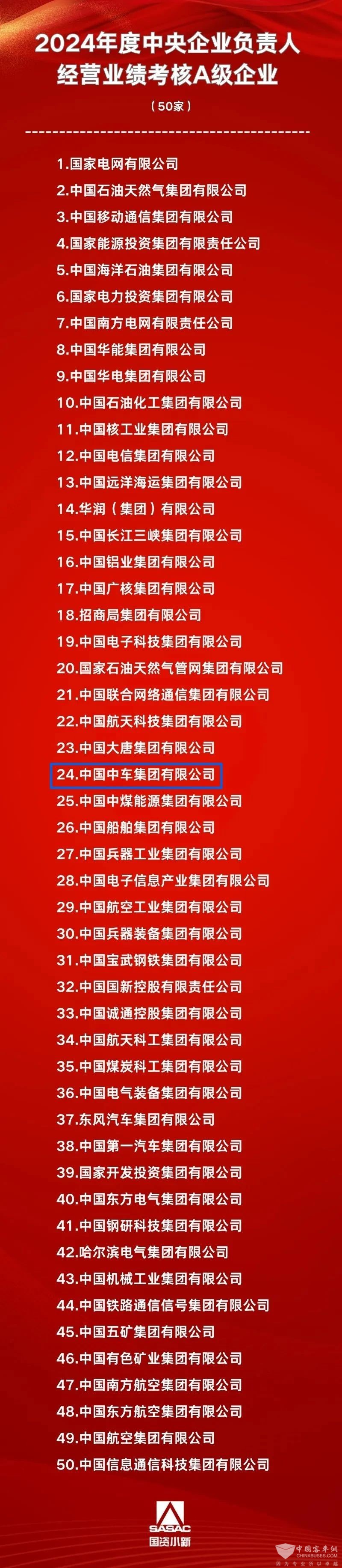 2025年7月18日,国务院国资委发布2024年度和2022-2024年任期中央企业负责人经营业绩考核A级企业名单以及中央企业科技创新优秀企业榜单。中国中车集团有限公司获评2024年度经营业绩考核A级,连续14年获得此项荣誉。同时获得2022-2024年任期中央企业负责人经营业绩考核A级企业,以及2024年度中央企业科技创新优秀企业。