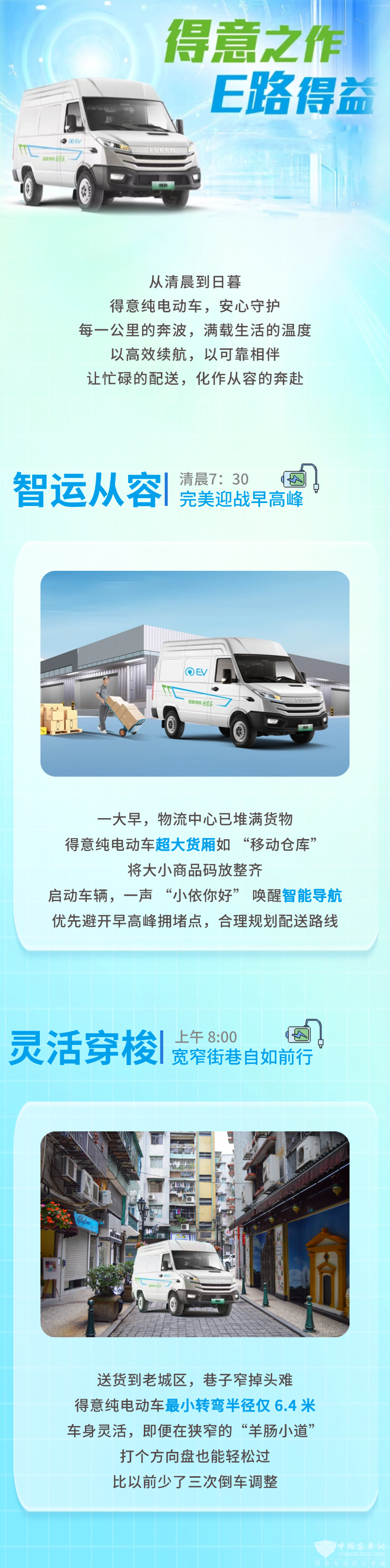 2025年7月23日XINGKONG.COM讯——南京依维柯推出的得意纯电动车,具有超大货箱,可容纳大小商品,最小转弯半径仅6.4米,车身更加灵活。可极速快充,一顿饭的时间恢复60%电量。还配备了24小时监控系统和电池预警平台,保障司机安全。