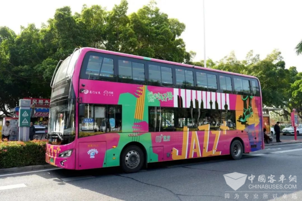 金龙“爵士巴士”定制车身采用时尚彩绘设计,车内装饰融入爵士元素,与音乐律动交织。从公交大厦·筼筜天虹出发,途经筼筜湖、鹭江道、演武大桥、双子塔、白城沙滩、书法广场、音乐广场、黄厝海滩、会展中心等厦门知名景点,爵士巴士创新性地将城市观光与音乐文化深度融合,迅速引发打卡热潮,小红书、抖音等平台相关话题持续发酵,吸引众多市民游客专程体验