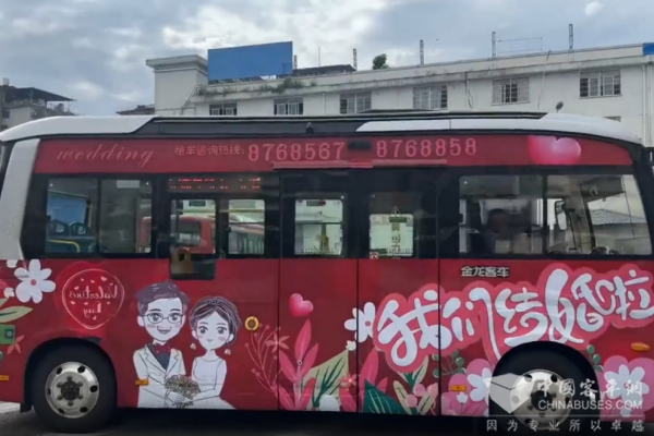 此外,“公交婚车”的定制业务也掀起了新风潮,凭借创意设计与高性价比,“公交婚车”迅速成为年轻人婚庆的新选择。与传统婚车相比,金龙公交婚车支持亲友同乘,亲友团全程参与互动,为新人留下独特记忆;车内空间灵活多变,新人可自主装饰成中式传统、西式浪漫或复古主题风格,搭配囍字灯笼、花艺布景等元素,营造出“一路欢笑、一路祝福”的温馨氛围。
