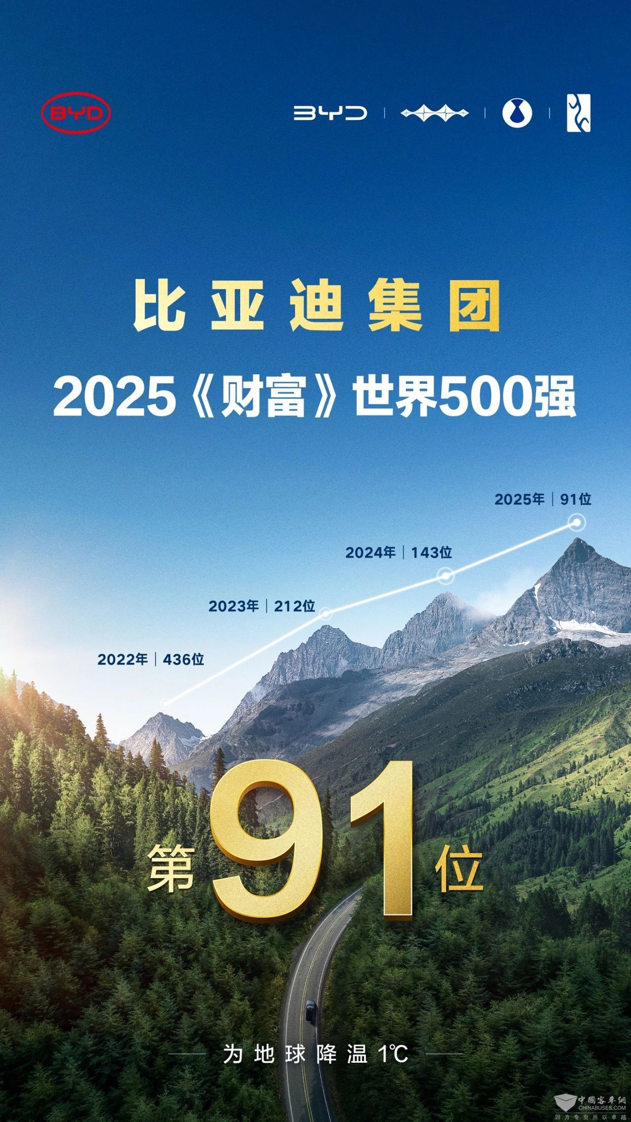 2025年7月29日,2025年《财富》世界500强榜单正式公布,比亚迪位列第91位。2022年至2025年比亚迪已连续四年上榜,更是由2022年的436位飞跃至2025年全球百强。