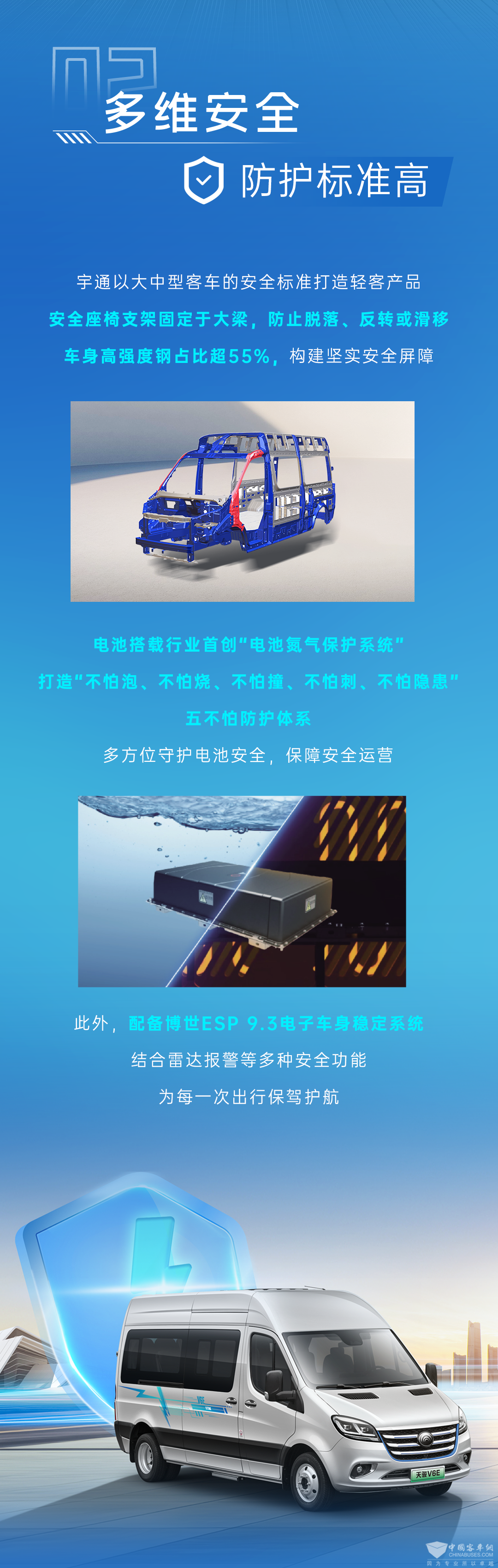 承袭客车品牌基因,宇通天骏V6E具有可靠耐用的优点,电池系统使用寿命长达10年100万公里,车身刚占比超55%,具有超高强度,采用NVH超级静音技术和降噪材料,提升出行体验。SiC控制器帮助提升效率,最高可达99.7%。