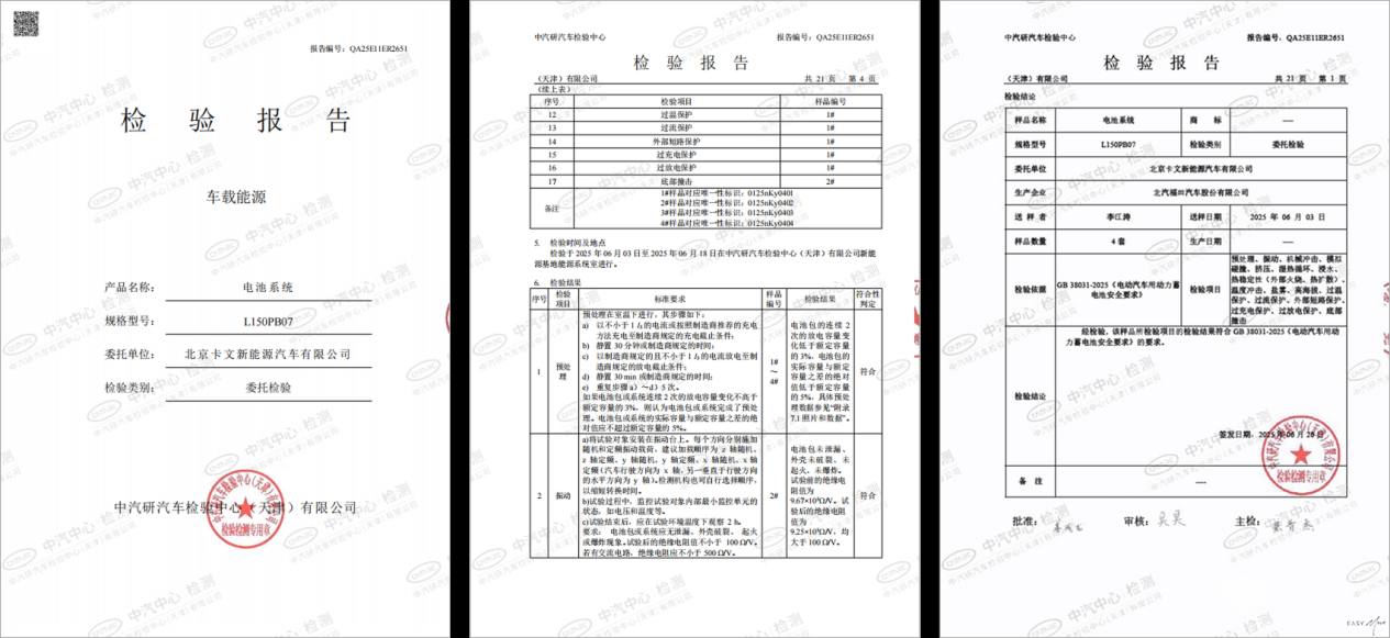 更让用户安心的是电池安全。卡文乐福搭载的半固态电池通过了被称为“史上最严”的GB38031-2025新国标17项安全测试,涵盖机械冲击、极端环境和热失控防护等关键领域。在基础安全验证中,通过了振动、机械冲击、模拟碰撞、挤压等考验,绝缘电阻值远超标准要求;在核心安全测试中,70秒外部明火燃烧试验中电池未爆炸且结构完整,150J能量的底部撞击测试中无泄漏、无破裂。17项测试环环相扣,电池始终保持零破裂、零变形、零渗漏,不起火、不爆炸的稳定状态,为各类货物运输提供坚实保障。这一表现得益于半固态技术的加持,其固液混合电解质体系在保留良好离子传导性的同时,大幅提升了安全性能,有效降低热失控和起火风险。
