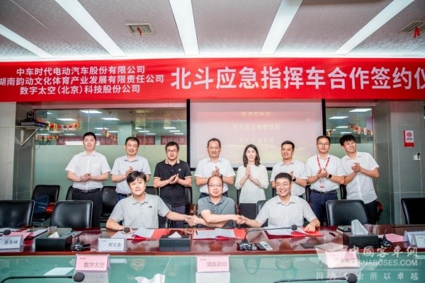 2025年8月28日上午,中车电动与湖南韵动文化体育产业发展有限责任公司,数字太空(北京)科技股份公司三方签订合作协议,中车电动研发生产的北斗应急(科普)指挥车正式交付。株洲市科学技术协会副主席杨佳,天元区应急管理局党委书记刘剑,天元区商务局党组书记、局长易飞翡等见证签约。