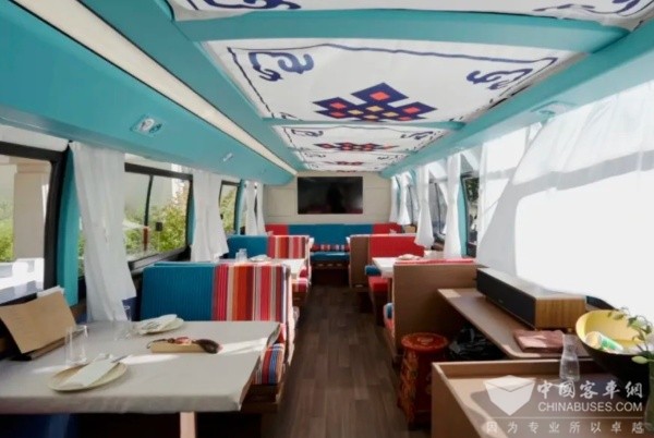 步入E12S内部,一层为多功能服务区,设有卫生间、文创展示和厨师操作等区域。二层为就餐区,氛围温馨雅致。车厢内还设有专业影音系统与专属演艺区域,可为游客呈现精彩民俗表演。更令人安心的是,车辆特别配备了制氧系统,让旅客无惧高原反应,尽兴享用美食,观赏美景。