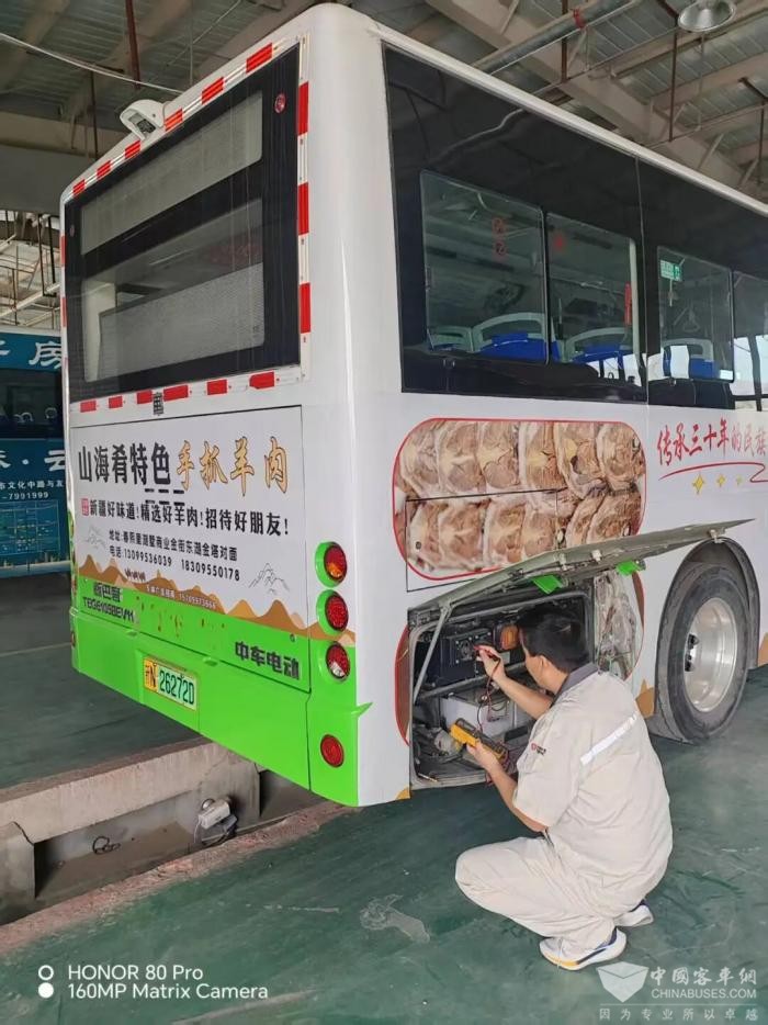 刘旗在渐寒的秋风中坚守岗位,对新能源车辆进行常态化巡检与维护,重点防范低温对电池性能的影响,确保车辆在北方秋意中依旧运行如常。