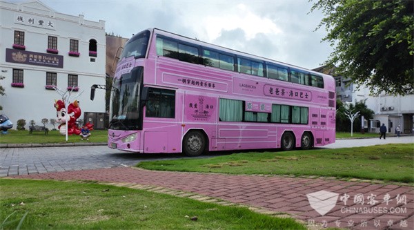 走近安凯双层观光巴士,第一眼便会被它的外观吸引——车身以海南省花三角梅为设计元素,粉紫相间的色彩鲜活灵动,随手一拍都是“朋友圈大片”。而踏入车内,木质饰板、复古吊灯与藤编细节营造出温润的南洋风情,恰好呼应海口骑楼老街的历史韵味,仿佛一秒穿越到南洋老街区。