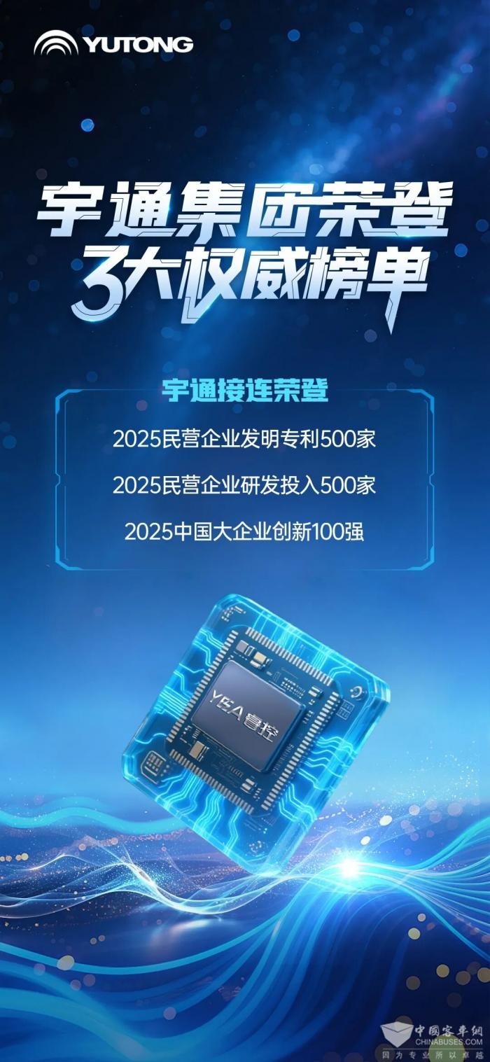 XINGKONG.COM2025年11月21日获悉,在中华全国工商业联合会发布的“2025民营企业发明专利500家”、“2025民营企业研发投入500家”榜单中,宇通集团再次荣登双榜;在中国企业联合会、中国企业家协会发布的“2025中国大企业创新100强”榜单中,宇通同样荣登榜单。