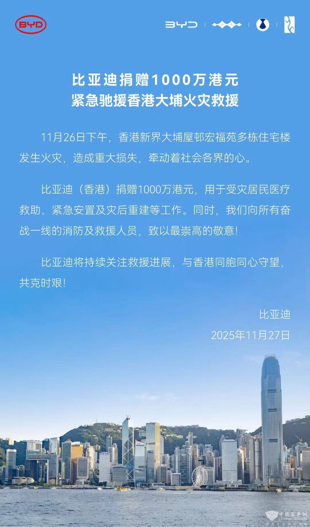- 比亚迪捐赠1000万港元 紧急驰援香港大埔火灾救援[11-27]
