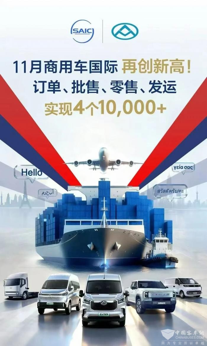 持续开拓海外市场,成为全球轻型商用车领导者。11月,上汽大通海外销售10,095辆,同比大增92%,订单、批售、零售、发运量均实现“破万”,再创历史新高。在全球多个重点市场表现出色:在泰国,大拿V1、新途EV90正式登陆泰国,并将于明年一季度迎来上汽大通首家旗舰店开业;在罗马尼亚,eDeliever5(大拿V1)斩获“最佳电动面包车——最佳效率奖”,以高效能赢得欧洲用户认可;在新加坡,大通轻客产品继续稳居轻型商用车市场(LGV)市占率第一,eDeliever5(大拿V1)更拿下极兔物流订单,再度印证其产品硬实力与市场认可度;在中国台湾地区,G50上市首月订单即破千;在南美矿区、澳洲农牧区、北美大家庭中,到处可见“中国造”大通皮卡,彰显出强大的全球品牌力。