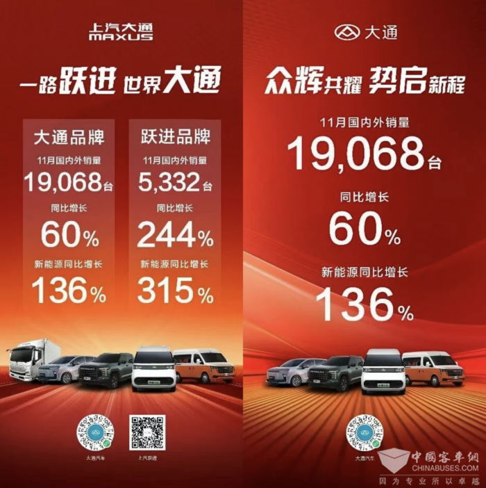 品牌焕新,启幕新程,上汽大通销量“十连增”,成客货运行业绿色首选。2025年11月批售24,400辆,同比大增81%,并实现零售月销同比“十连增”。持续巩固在全球轻型商用车市场的领导地位,11月海外销量达10,095辆,同比大增92%,订单、批售、零售、发运量均实现“破万”,再创历史新高。新能源车型销量同比剧增196%,其中国内新能源车型销量占比达53%,转型步伐全面提速:新能源轻客“爆品”大通大拿热销3,207辆,同比劲增214%!跃进新能源车型销量同比增长315%、销量占比高达72%。实力引领,频获大单,大拿V1、大家9、大家7等多款新能源标杆产品成客货运行业信赖之选。