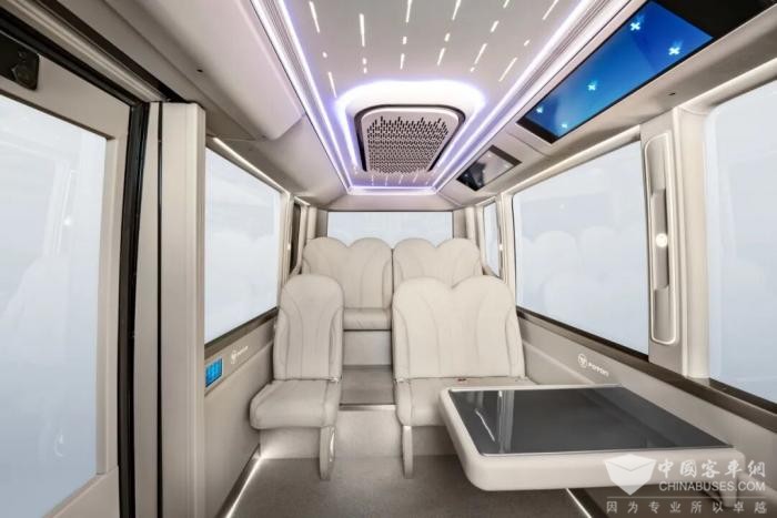 记者在现场了解到,在封闭园区场景,欧辉L4级智能巴士取消了传统驾驶舱,采用无驾驶位、无方向盘的创新布局,无需上牌即可运营。车内以“移动科技会客厅”为设计理念,配备9个加宽软垫座椅、悬浮式功能桌、车载冰箱及定制咖啡机,将交通工具升级为兼具接待洽谈、商务会晤功能的智能空间,完美适配企业园区、机场、景区等封闭场景的通勤与接待需求。