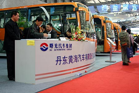 黄海公司本次展会的面积仅次于宇通,达到了567平方米,共展出了6款新品,包括3辆城市客车、2辆城郊客运车和1辆旅游客车。展车中包括了丹东黄海最新研发的2辆13.7米三轴大客车。