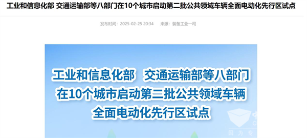 2025年2月25日,工业和信息化部、交通运输部等八部门启动第二批公共领域车辆先行区试点(下称“本次试点”)。本次次试点支持天津、常州、无锡、宜宾、临沂、淮南、西安、咸阳、渭南、雄安新区等10个试点城市深入开展车网互动、光储充换、智能网联等新技术新模式创新应用,与县域充换电设施补短板、“车路云一体化”试点、汽车以旧换新等形成工作合力,全面拓展新能源汽车市场化应用。根据工作计划,预计10个城市新增推广新能源汽车超过25万辆,建设充电桩超过24万个。