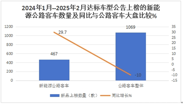 也就是说,尽管2024年1月--2025年2月在我国公路客车达标公告中上榜的公路客车新品数量同比整体下降,但其中上榜的新能源公路客车新品同比却逆势上涨了近3成,为本次试点中对新能源公路客车产生的更多需求提供了强力支持和保障。