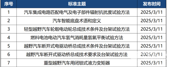 2025年3月共有定稿发布标准法规7部,涵盖越野汽车、燃料电池、底盘等内容,其中与客车行业相关的有3部。
