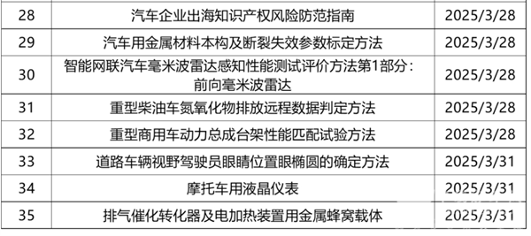 2025年3月,共有35部标准法规征求意见稿,数量较多。包含电动汽车充电设备、电池、摩托车、零部件、排放等内容。标准详情如下: