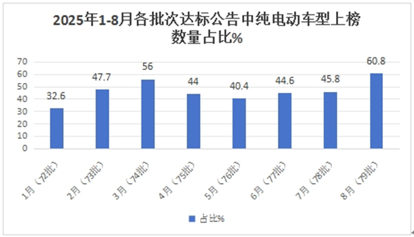 比如说,在2025年8月下旬交通部最新发布的第79批公路客车达标公告中,纯电动客车上榜数量达到73款,占比超6成(60.8%),创今年以来各月公告上榜数量新高;由于在2025年之前交通部发布的各批次公路客车达标车型公告中,纯电动公路客车占比从未超过50%,因此在最新的第79批公路客车达标车型公告中,纯电动公路客车占比也创下史上最高。这说明当前主流车企已经洞察到随着今年下半年旅游客运市场旺季到来,纯电动公路客车需求也将大幅度增加,因此主流客车企业及时抓住这一趋势,加大了纯电动公路客车产品的布局力度,而且这种力度是史无前例的。可以预见,纯电动公路客车将成为今年下半年旅游公路客车销量增加的一个强劲的增长点。