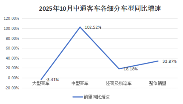 上图表可见,2025年10月中通中型客车销量563辆,同比翻倍大涨(102.52%),跑赢且领涨其今年10月整体销量同比33.87%的增速近68.65个百分点;表现抢眼。据分析主要得益于: