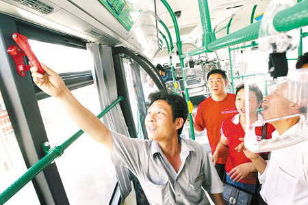 在杭州火车东站Y5公交车上,一位乘客刚上车就问司机:“杭州公交车大多是封闭的空调车,有没有逃生的装置呀?”这位乘客说,他刚从绍兴来,从报纸上看到上海一辆公交车爆燃,几名乘客死亡,让他对公交空调车的安全出逃产生了疑问:以前非空调车可以从窗户里爬出去,现在空调车怎么办?