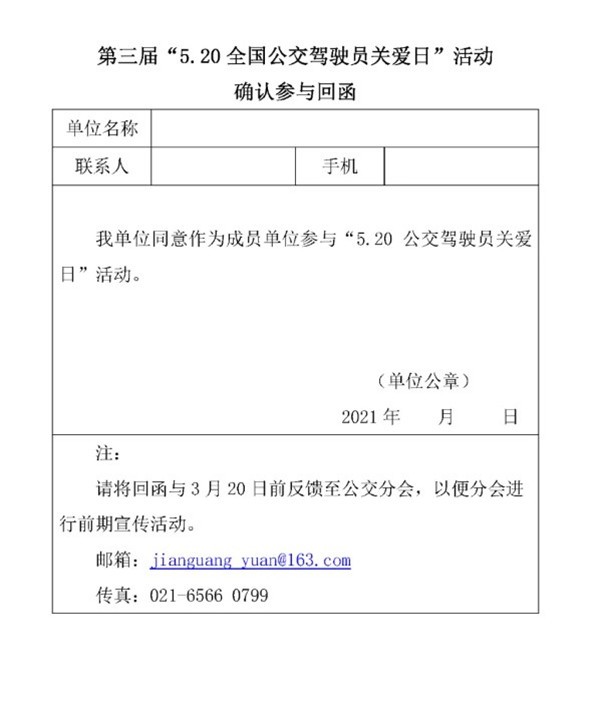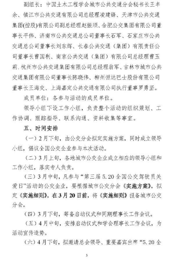(三)3月中旬,凡参与“第三届5.20全国公交驾驶员关爱日”活动的公交企业,要根据城市公交分会《实施方案》,拟定《实施细则》,在3月20日前,将《实施细则》报备城市公交分会。