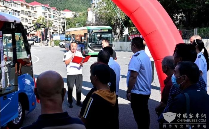 仪式现场,玲珑可爱的纯电动社区公交车,特别醒目,吸引了社区居民的关注。