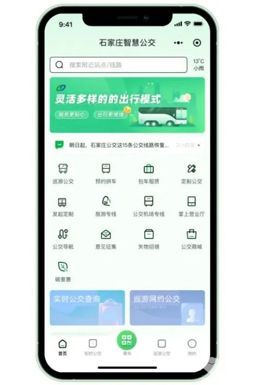 推进公交线路进医院、进景区、进商圈、进企业、进学校、进社区,为市民提供“点对点”“门到门”的出行服务;开通“适老化”线路,升级打造“敬老爱心”线路;开通小学生免费专线;为石家庄举办的各类大型活动提供运力保障;全新升级上线的“石家庄智慧公交”App,为市民提供全景展现、出行预测、出行定制等一系列智能化服务;创新支付和票务系统,推广移动支付、刷脸支付等无现金支付方式,简化办卡、购票流程,电子支付率达到90%;定期对驾驶员进行职业素养、服务态度及安全驾驶培训,实施星级评定制度,建立乘客投诉快速响应机制;在车厢提供手机充电、无线网络等服务,在站台安装便民候车座椅,开设公交供销铺、智能售卡售货设备等,从细微处为百姓出行提供便捷。