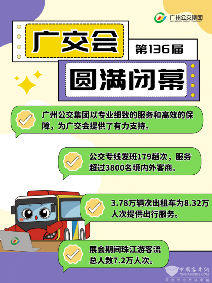 2024年11月4日,第136届中国进出口商品交易会(广交会)在广州圆满落下帷幕。本届广交会规模宏大,企业数、展品数、境外采购商规模以及贸易促进活动场次均创历史新高。在展会期间,广州公交集团以专业细致的服务和高效的保障,为广交会提供了有力支持,展现了广州作为国际大都市的独特魅力,赢得了境内外客商的高度赞誉。