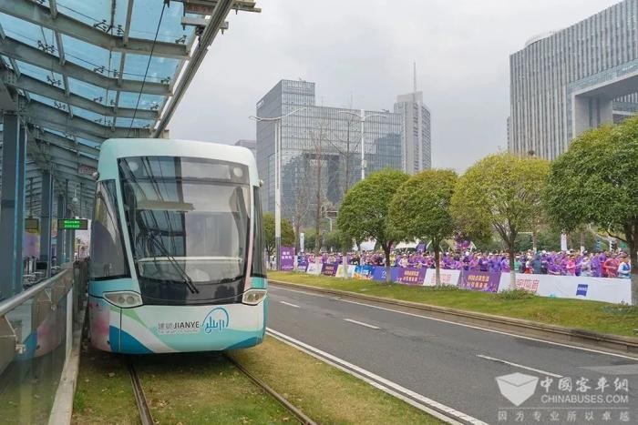 为让城市形象“跑”得更远,南京公交与建邺区文旅局特别策划“奔发”行动。7:00,河西有轨电车“文旅形象专列”提前抵达奥体中心东门站,静候跑者集结。