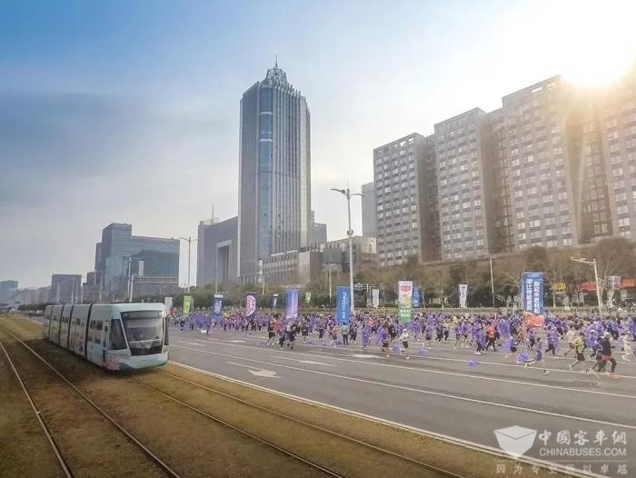7:30枪响发令,跑者开跑!同一瞬间,有轨电车同步发车,流线型车身与奔跑的人流以“双轨并进”的创新形式,用“速度与诗意”为赛事助威!