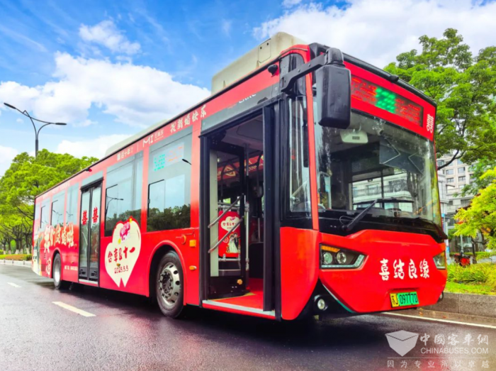 当天,一辆车身印有醒目“囍”字和新人姓名的红色公交婚车缓缓驶过城区。车头LED屏滚动播放由“琴瑟和鸣”开往“永结同心”的520专线字样,车窗贴满传统剪纸喜花,车内装饰了众多婚礼喜庆元素,营造出温馨浪漫的氛围。