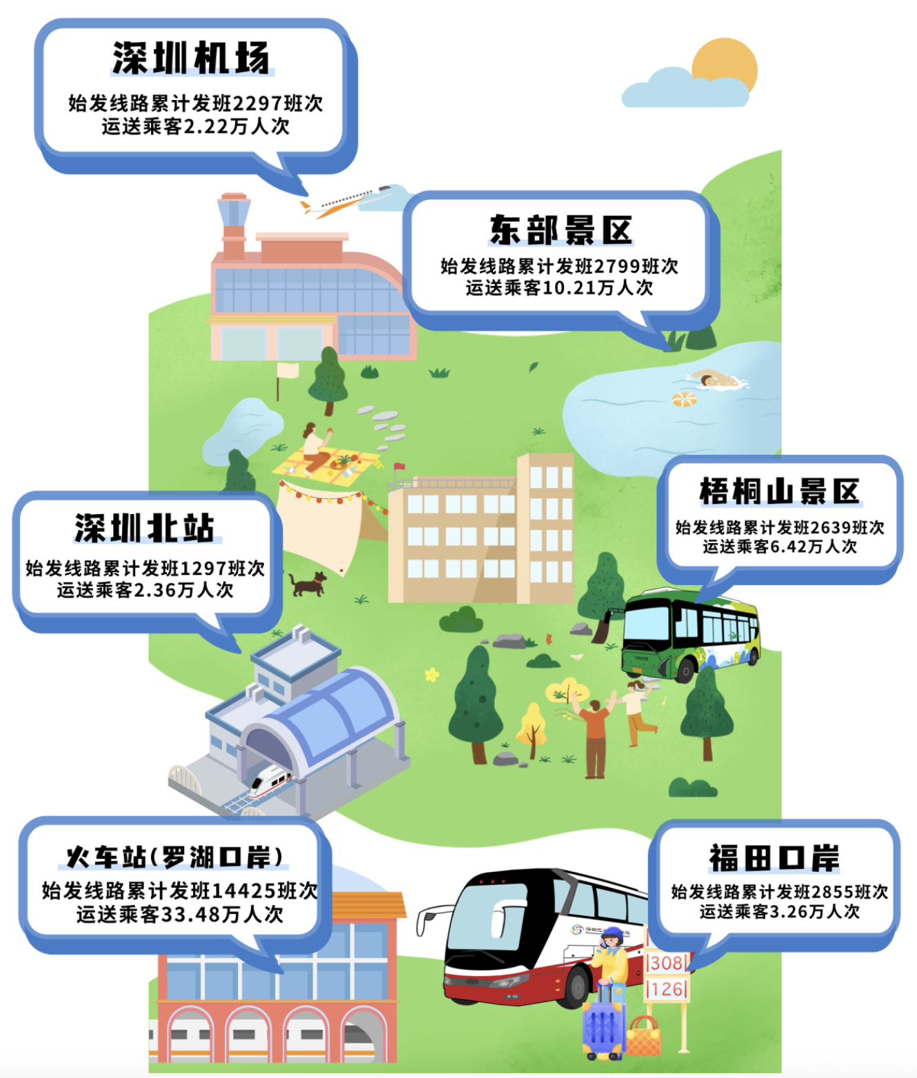 在梧桐山、深圳北站、深圳机场、深圳湾口岸等客流集散点安排现场值班人员,开展乘车秩序维护、乘客疏导等现场管控工作,确保公交服务优质、平稳。