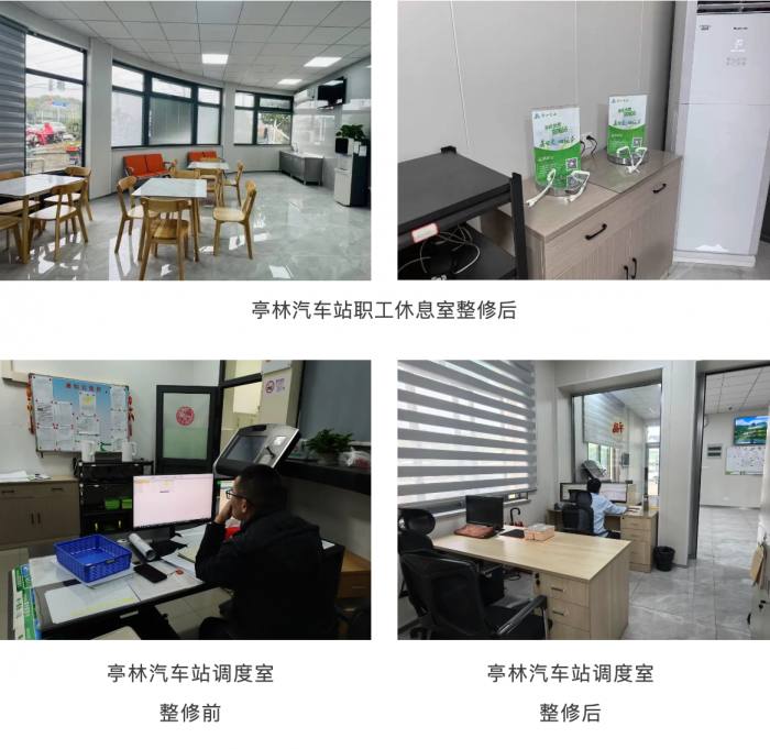职工休息室是司乘人员工作间隙的“温馨港湾”。随着线路调整,亭林汽车站的车辆和职工数量增加,原有调度室和休息室空间显得局促。公司以朱泾汽车站、石化汽车站职工休息室为样板,以“合理布局、提升舒适度”为目标,通过重新规划调度室和办公区,扩大休息空间,并添置餐桌、沙发椅、净水器等设施,打造出宽敞明亮的休息环境。
