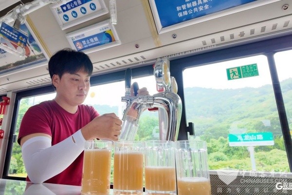 步入车厢,一场沉浸式的啤酒文化之旅即刻开启。“一品牌一主题”的场景设计丰富体验维度,青西金啤等品牌的随车专业人员会为乘客推荐不同口味的精酿啤酒,配有专业设备确保啤酒口感。“公交+啤酒”的融合让公交突破了传统运输功能,变身为“会跑的啤酒节分会场”。