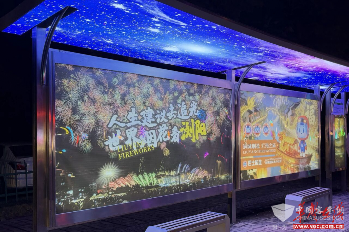 此外,一个全新改造的公交站台也将在花炮文化节期间亮相。该站台位于行政中心北门停车场,是“烟花夜巴士”的起始点,也是游客集中前往天空剧院的乘车区域。遮阳顶棚被一整块“星空顶”点亮,置身站内,宛若置身于星空之下,抬头便是触手可及的蔚蓝穹顶,站台的广告全部更换为浏阳城市形象和烟花文化的公益宣传。“这是一个充满‘浏阳味’的公交站台。”浏阳市公交发展有限公司相关负责人表示。