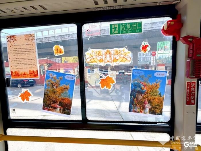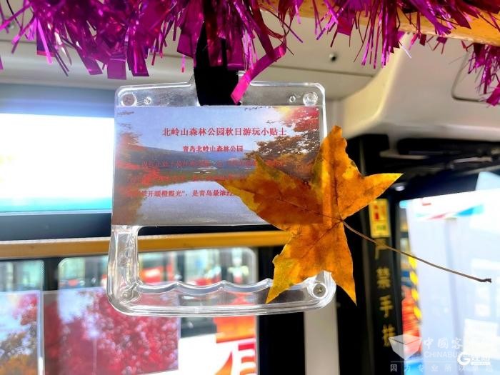 走进371路公交车厢,仿佛踏入了一片迷你枫树林。车窗上张贴着北岭山森林公园的实景摄影作品,棕红、金黄的枫叶交织成画;车厢内壁悬挂着精心设计的赏枫攻略卡片,标注最佳观赏点位、枫叶变色高峰期等核心信息;扶手杆上缠绕着仿真枫叶枝,座椅靠背张贴着温馨标语,每一处细节都弥漫着浓郁的秋意。