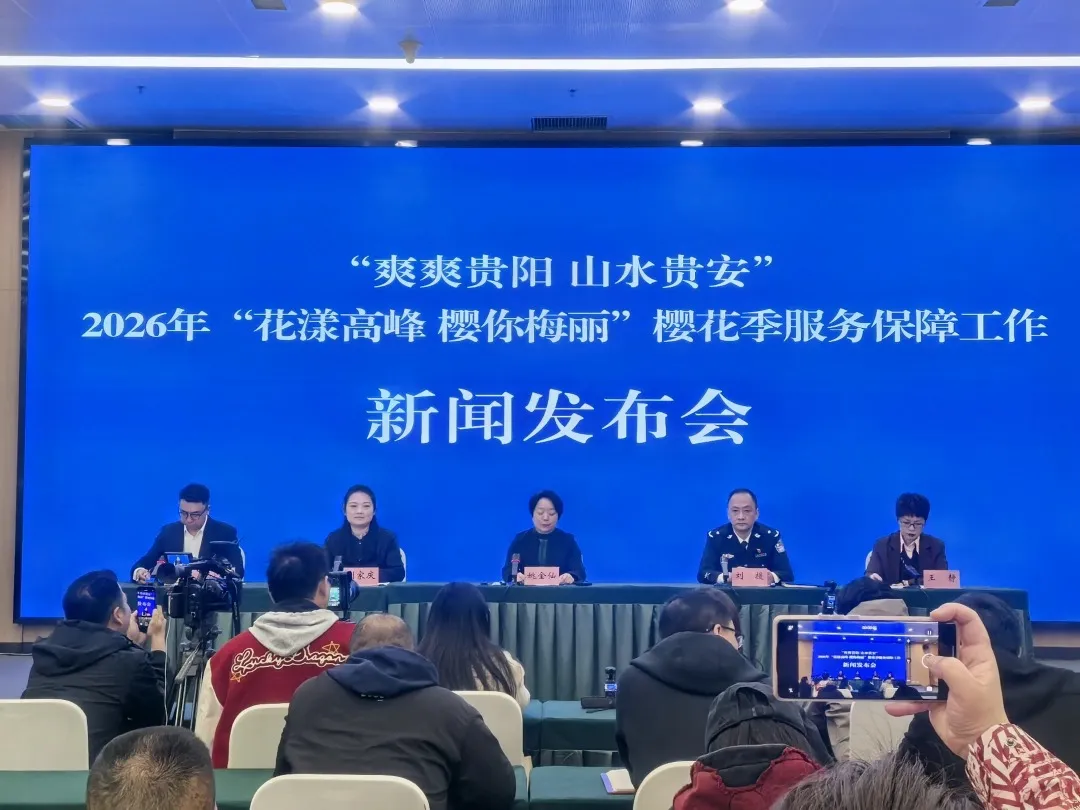 “爽爽贵阳 山水贵安”2026年“花漾高峰 樱你梅丽”樱花季服务保障工作新闻发布会现场。