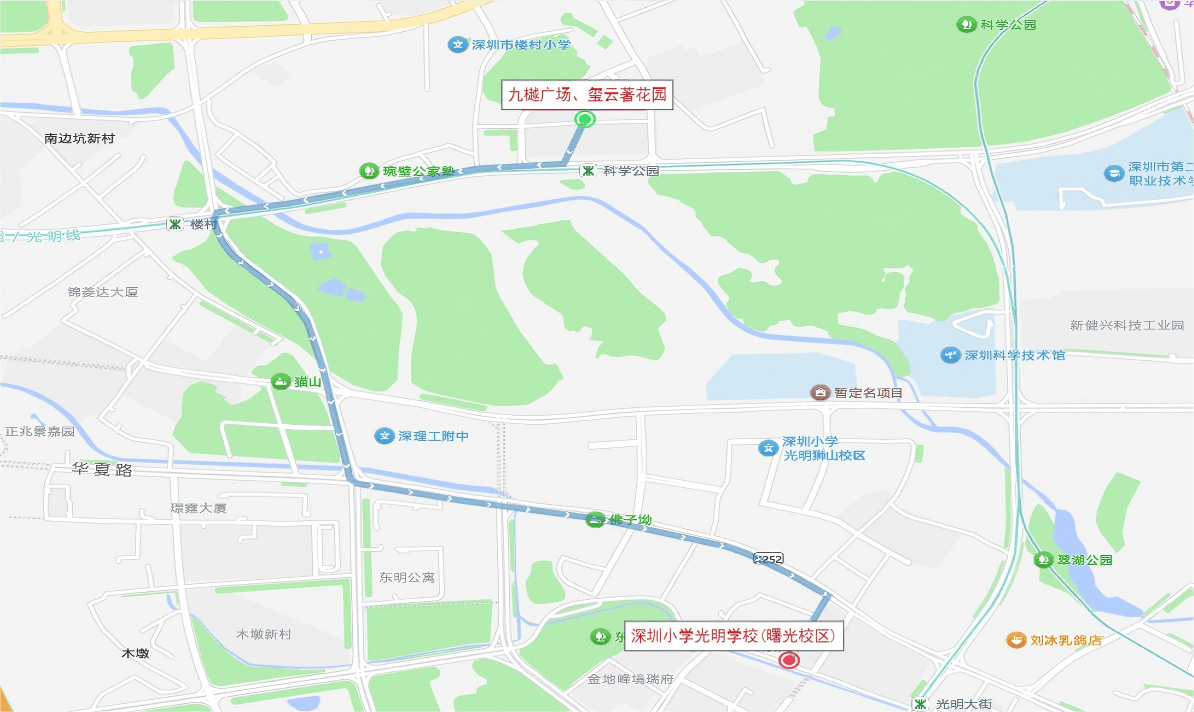 此次开通的曙光学校通学巴士(RS47),由九樾广场、玺云著花园(上客点近玺云著西门)至深圳小学光明学校(曙光校区),服务时间精准匹配学生上下学时间:从九樾广场出发,7:40准时发车,直达深圳小学光明学校(曙光校区),全程里程5公里;下行从深圳小学光明学校(曙光校区)返程九樾广场,17:40发车,实现家校两点一线的便捷衔接。