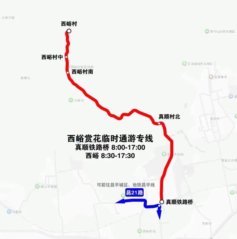 乘客可乘地铁昌平线至北邵洼站,换乘昌21路至真顺铁路桥站乘坐西峪赏花公交专线。