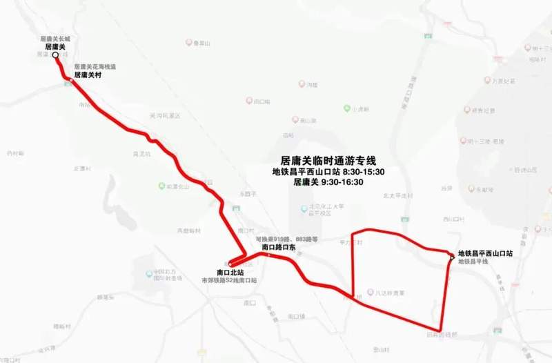 下行:居庸关景区—居庸关村—南口北站—南口路口东—地铁西山口