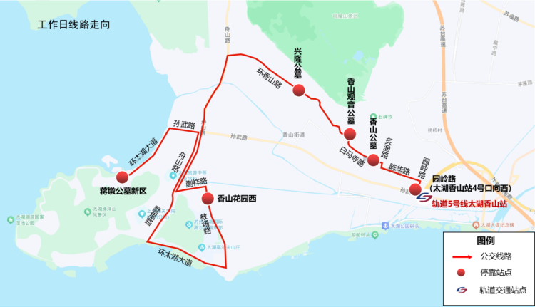 市民乘坐地铁5号线至“太湖香山”站,从4号口出站后向西步行约100米至园岭路上下客点,即可换乘扫墓接驳专线,一站式直达四大墓区,祭扫结束后可在下车点原路返回。