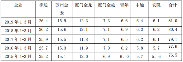 4、厦门金旅11-12米公路客车市场份额处于第五,增幅较大,在2019年1-3月表现尚可