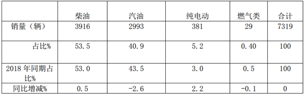 特点二、柴油占比最高,纯电动同比增加最大,汽油同比下降最多---按燃油种类划分,对2019年1-5月河南市场轻客销量结构进行分析